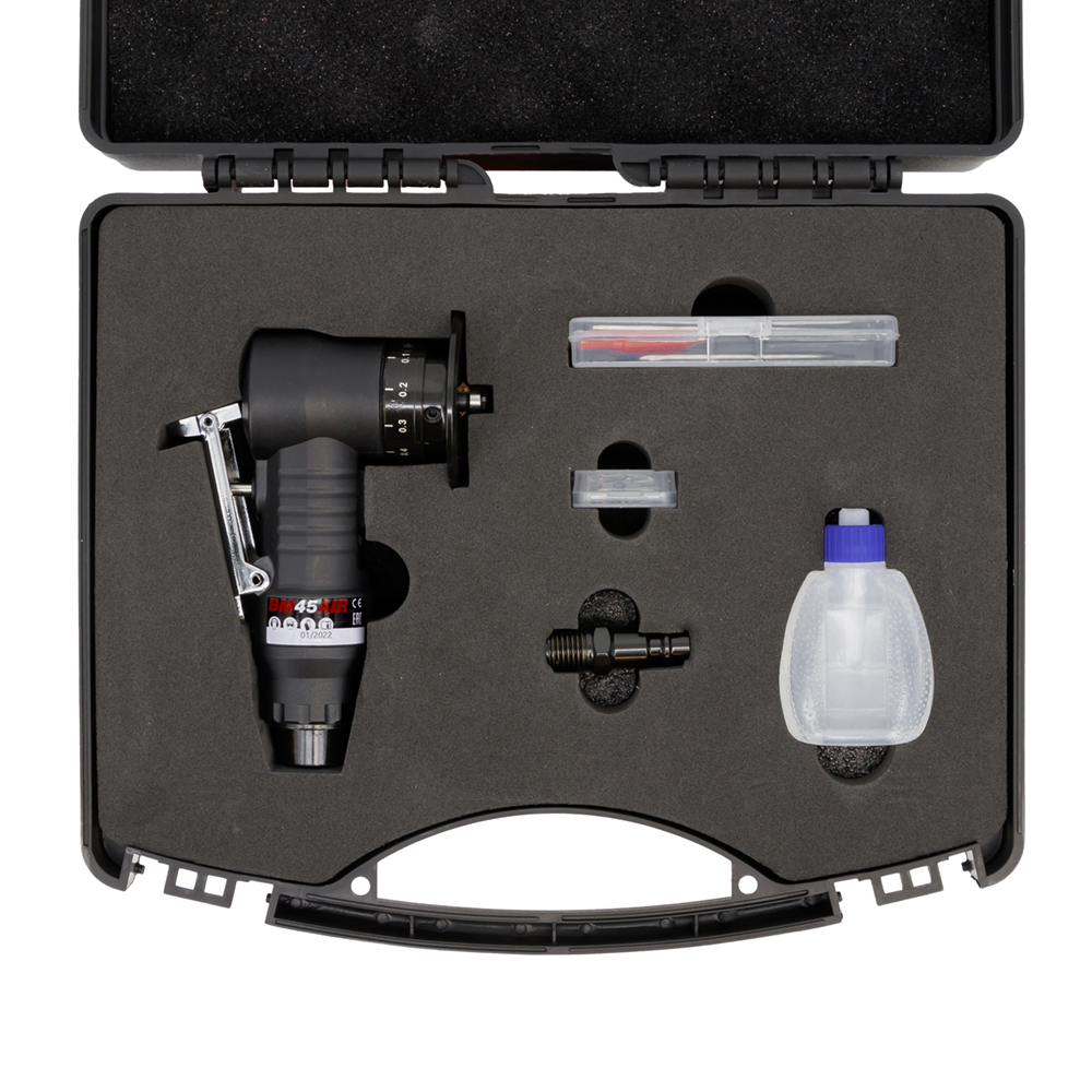 BM45AIR er den mindste affasemaskine i vores sortiment. Selvom den er lille nok til at passe i hånden, skal du ikke undervurdere dens kraft! Den er designet til affasning og afrunding af kanter på stål, rustfrit stål, aluminium og andre materialer. Ideel til bearbejdning af huller med en indre diameter på mindst 8 mm.