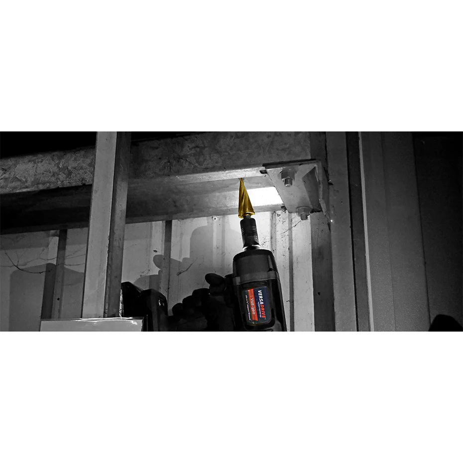 VersaDrive® TurboTip Impact ConeCutters (505050) Den nye Impact-klassificerede TurboTip ConeCutter er designet til tynde materialer som el‑bokse eller pladearbejde. Ideel til at udvide et for lille hul, så en kabelgennemføring passer. TurboTip’s trappede spids gør, at hullet kan startes hurtigt uden pilotbor. Den korte borelængde gør den velegnet til brug i trange rum.